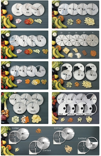 Диски E1, E2, E3, E4, E6, E8. E10, E14 и специальные диски EC используют вместе с дисками B и D для нарезки картофеля фри и нарезки кубиками.