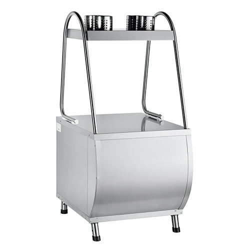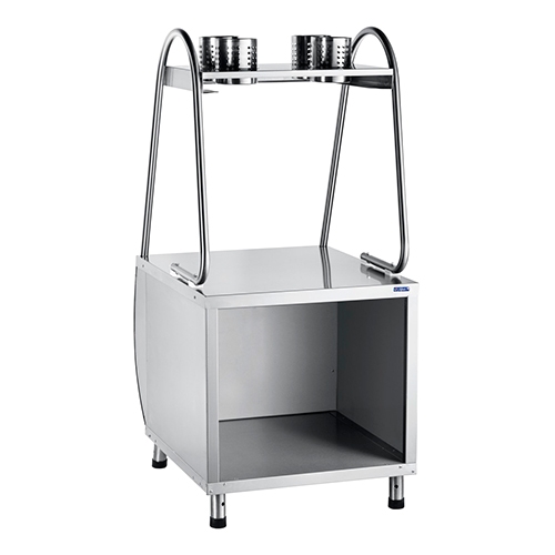 Прилавок для столовых приборов и подносов предназначен для хранения столовых приборов (ножей, ложек и вилок) и подносов. На верхнюю столешницу устанавливается 4 емкости для столовых приборов. Снизу расположен закрытый отсек для подносов или инвентаря. Прилавок имеет регулируемые по высоте ножки.