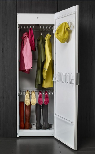 Сушильный шкаф Asko DC7774 V.W отличается современным дизайном, который прекрасно впишется в интерьер прачечной или другого аналогичного помещения. Его корпус выполнен из высококачественной стали, что придаёт ему прочность и долговечность. Фасад прибора выкрашен в белый цвет, который легко сочетается с другой бытовой техникой по уходу за бельем. Внутри расположено множество полочек, держателей и вешалок. Есть специальный отсек для перчаток. С ним даже «капризные» изделия не сядут и не потеряют форму. Ящик для обуви позволяет сушить кожаные ботинки и резиновые сапоги. Материал не портится и не лопнет.