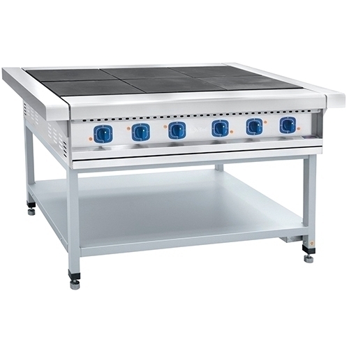 Температура рабочей поверхности конфорки 480°C, Время разогрева конфорки до max t 30мин, Размеры конфорок, мм 295x417, Плита установлена на крашенную порошковой краской подставку и имеет регулируемые по высоте ножки.