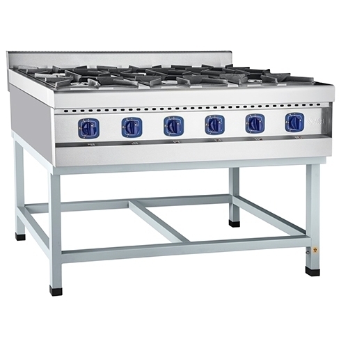 Плита газовая кухонная 6 горелочная ПГК-69П с ндс - Плита газовая настольная имеет четыре горелки по 5,5 кВт, и две горелки повышенной тепловой мощности "двойная корона" - 7,5 кВт. Расход газа природного - 3,7 м3/ч, сжиженного - 2,72 кг/ч. Внизу - открытая разборная подставка. Модель снабжена устройством "газ-контроль" и регулируемыми по высоте ножками. В комплекте поставляются дополнительные съемные форсунки под "сжиженный" газ.