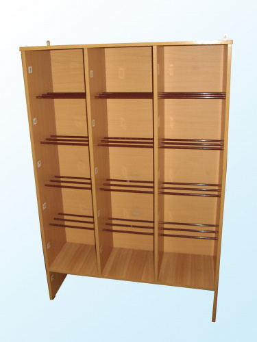изготовлен из ЛДСП, торцы облицованы кромкой ПВХ 2 мм, каждая полка выполнена из трех труб диаметром 10 мм и окрашена порошково-полимерной краской. Дно шкафа изготовлено из ДСП с пластиковым покрытием