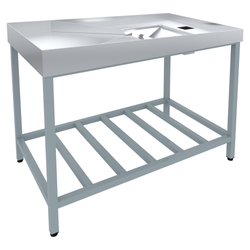 Стол для переборки круп СРОп-1350 имеет разборную конструкцию. Каркас выполнен из профильной трубы 40х40, окрашенный порошковой краской. Столешница, выполненная из нержавеющей стали, имеет с четырех сторон борта и две направляющие, для отделения крупы. Также на столешнице имеется окно из оргстекла с подсветкой, для удобства сортировки крупы. На выходе с рабочей площадки в столешнице имеется прямоугольное отверстие с патрубком размером 100х100х150 для сбора отсортированной крупы в функциональную емкость.