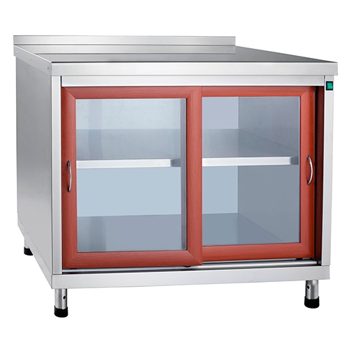 Все детали стола изготовлены из нержавеющей стали. Стол оснащен двумя дверцами-купе, изготовленными из МДФ со стеклянными вставками, и сплошной полкой, регулируемой по высоте. Внутренний объем стола имеет две лампы подсветки, мощностью по 30 Вт. Допустимая нагрузка на столешницу (не более): 100 кг. Допустимая нагрузка на полку (не более): 30 кг. Регулируемые по высоте ножки.